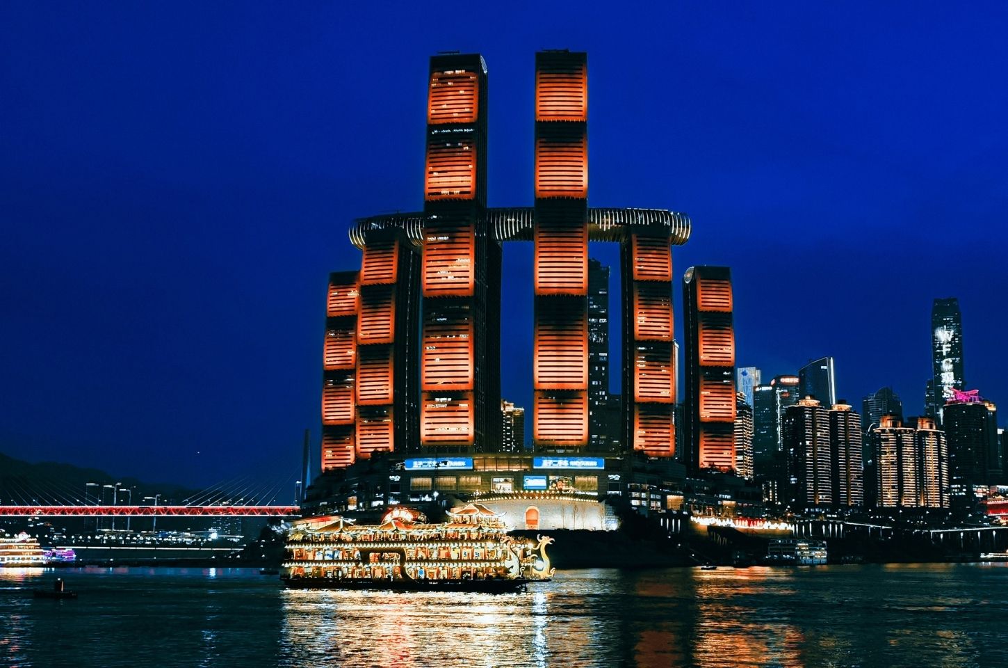 โครงการมิกซ์ยูสริมจุดบรรจบสองแม่น้ำ ออกแบบโดยสถาปนิกระดับโลก พร้อม “สกายบริดจ์” แนวนอนยาวหลายร้อยเมตรเชื่อมยอดอาคาร คล้ายเรือสำเภาแล่นบนสายน้ำ สะท้อนบทบาทฉงฉิ่งในฐานะประตูการค้าเส้นทางแม่น้ำสู่จีนตะวันตก