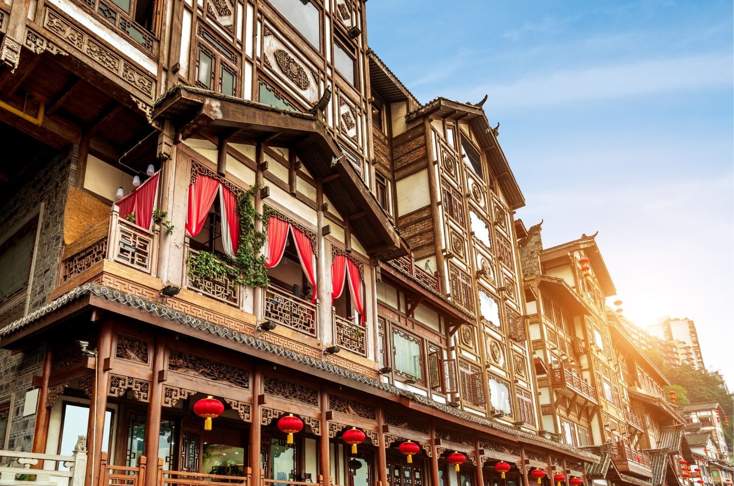 คอมเพล็กซ์ 11 ชั้นริมแม่น้ำเจียหลิง ออกแบบจำลองสถาปัตยกรรมพื้นถิ่นแบบ “เตียวเจียวโหลว” (อาคารยกพื้นตามไหล่เขา) โครงสร้างซ้อนชั้นตามความชันภูเขา ทำให้ระดับทางเข้า–ออกต่างกันในแต่ละชั้น ยามค่ำคืนแสงไฟสะท้อนผิวน้ำจนถูกเปรียบกับฉากอนิเมชัน มีร้านอาหารเสฉวนดั้งเดิม ชาเฮาส์ และจุดชมวิวที่เห็นเส้นขอบฟ้าเจี่ยฟ่างเป่ย